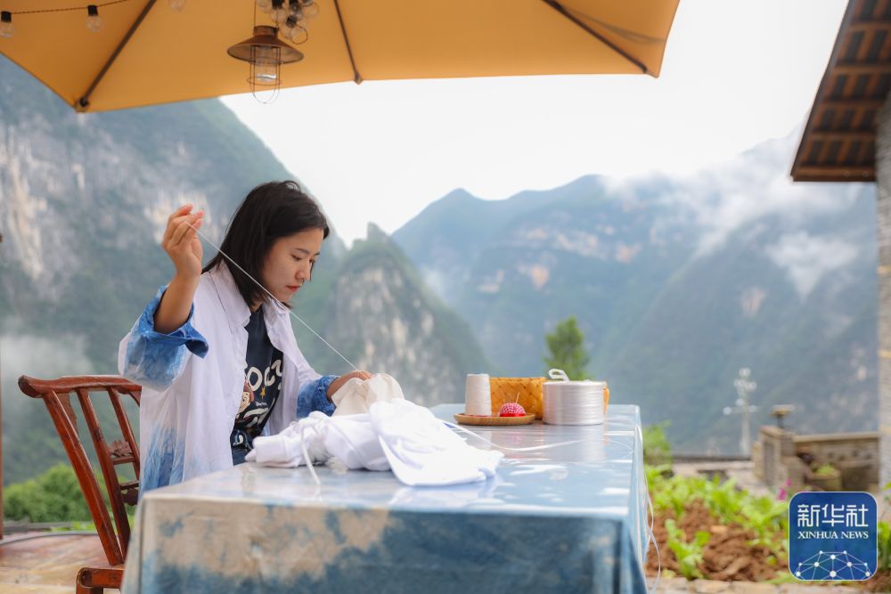 ↑2023年10月10日,在重庆市巫山县竹贤乡下庄村,31岁的袁孝鑫在创作扎染图案。袁孝鑫是下庄村人,大学毕业后一直在重庆城区工作。2022年初,袁孝鑫回到家乡,创办“下庄布谷”植物扎染工坊。袁孝鑫表示,未来她将在家乡大力发展扎染产业,传承非遗文化,为乡村振兴贡献力量。
