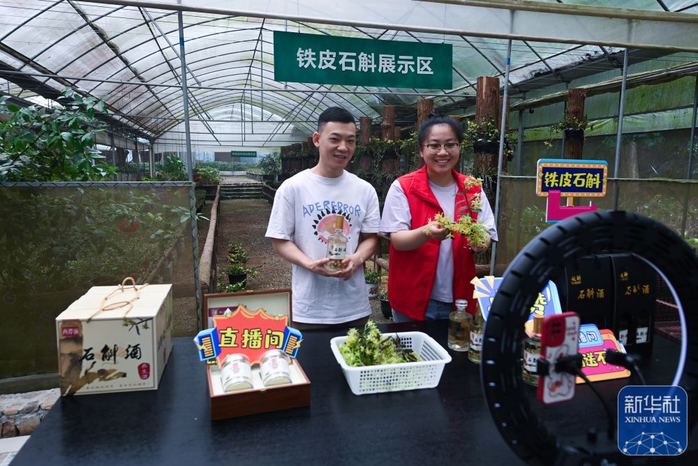 ↑2023年6月8日,在诸暨市东白湖镇的铁皮石斛有机种植基地,基地负责人孙思宝(左)和志愿者一起直播卖铁皮石斛花茶、铁皮石斛酒等产品。铁皮石斛和果蔬是浙江省诸暨市东白湖镇的特色农业产业。