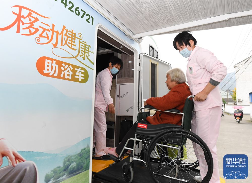 ↑2023年11月30日,在浙江省余姚市梁弄镇甘宣村,一家结对帮扶的养老机构将助浴车开到村民家门口,为行动不便的老人洗浴。为推进乡村养老工作,促进公共服务均衡覆盖,浙江省余姚市自今年7月起启动专项行动,发动服务机构、社会组织等向山区输送养老服务。