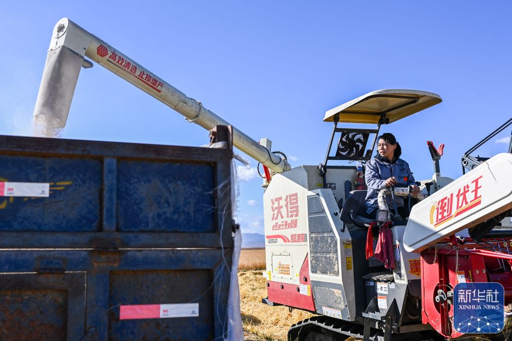 ↑2023年10月20日,“80”后刘春艳在珲春市三家子满族乡东岗子村的水稻田里驾驶收割机收割水稻。刘春艳2013年创建春艳种植专业农场,目前农场已实现生产、加工、销售融合发展,实现了5000亩水稻、玉米、大豆全程机械化作业,水稻年产量达到3000吨,年产值达2500多万元。