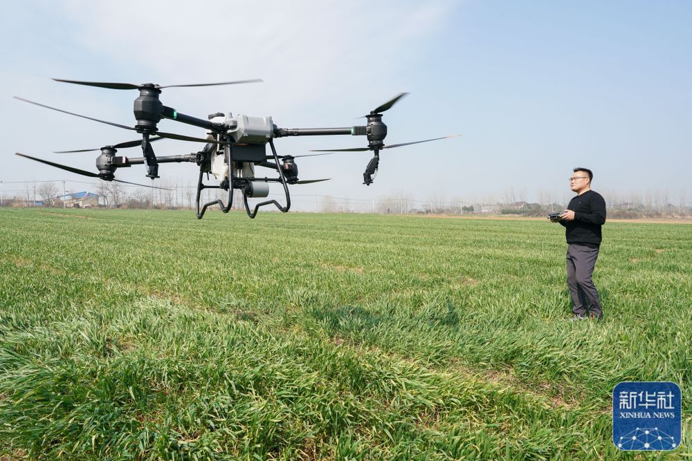 ↑2023年2月28日,王昌在来安县水口镇拥巷村操作植保无人机喷洒除草剂。今年27岁的王昌是安徽省滁州市来安县水口镇拥巷村人。2018年大学毕业后返乡,在家人的支持下成立了农机专业合作社,吸纳1000余户农民加入,为当地农民提供农业机械化作业、农业种植技术培训等服务,带动周边村民共同致富。