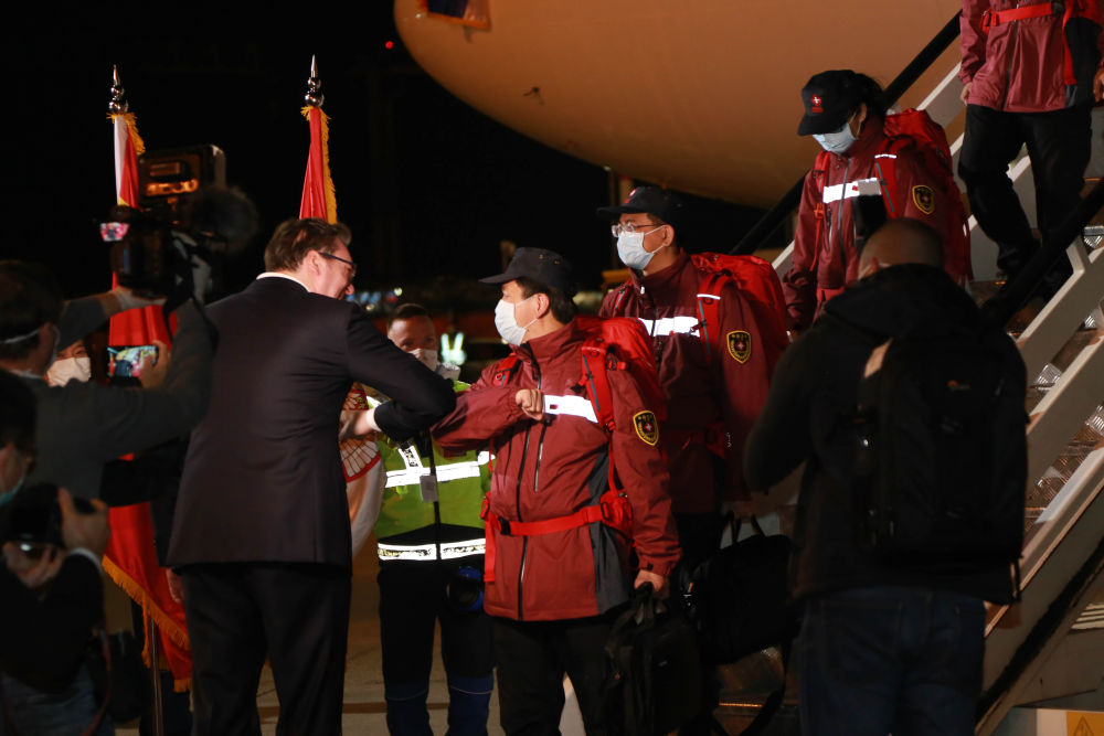 这是2020年3月21日,在塞尔维亚首都贝尔格莱德,前来迎接的塞尔维亚总统武契奇(左)与中国援助塞尔维亚抗疫医疗专家组成员“碰肘”致意。新华社记者 石中玉 摄