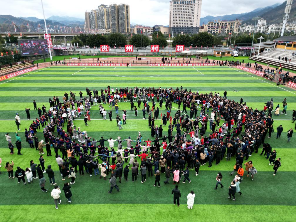 比赛结束后,两队队员、亲友团和大批观众手拉手跳起侗族舞蹈。新华社发(王炳真摄)