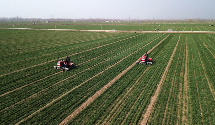 山东省汶上县,农民驾驶农机在高标准农田里进行小麦春季管护作业(2024年3月13日摄,无人机照片)。新华社记者 徐速绘 摄