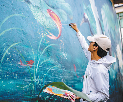 刘志诚在三川镇进行墙绘创作。