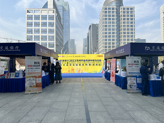 交通银行苏州分行作为本届赛事的独家冠名商,在金鸡湖马拉松博览会现场设立了服务展台,为参赛选手提供赛事相关服务,还在展台上设置了马拉松留影纪念区,众多跑友留下了精彩瞬间,同时还将苏州交行优质的金融服务延伸到了金鸡湖马拉松博览会的现场。