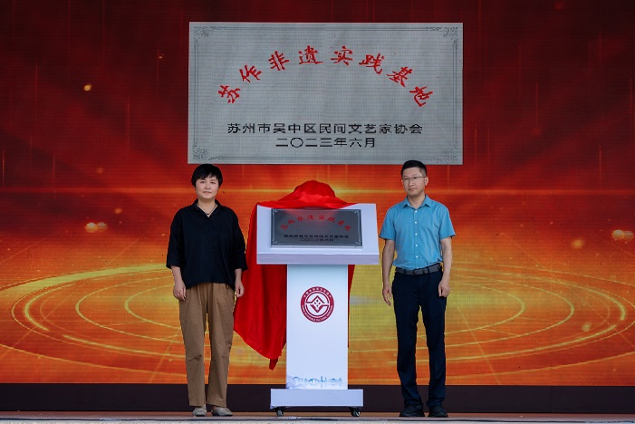 吴中区民间文艺家协会主席陆小琴和甪直镇党委委员张春茂为“苏作非遗实践基地”揭牌。