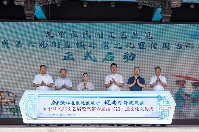 为保护传承和弘扬发展非物质文化遗产,践行“美丽中国”和“文化强国”的发展理念,将更多文化艺术资源转化为社会美育资源,促进吴中区及甪直镇文化旅游事业再上新台阶,由苏州市吴中区文化体育和旅游局、吴中区文学艺术界联合会、甪直镇人民政府联合主办,吴中区民间文艺家协会和甪直镇文化体育活动中心承办的吴中区民间文艺展览暨第六届甪直镇非遗文化宣传周活动,在甪直镇江南文化园古戏台隆重揭幕。