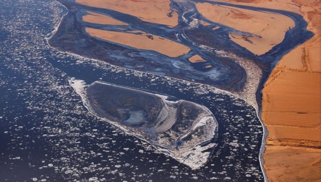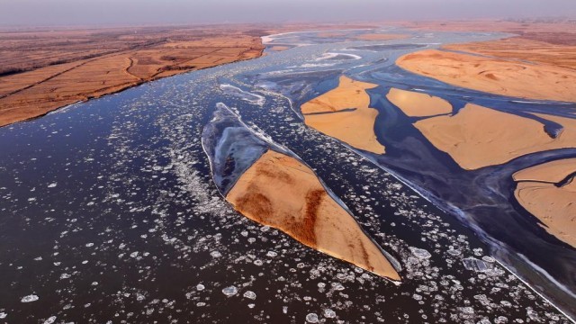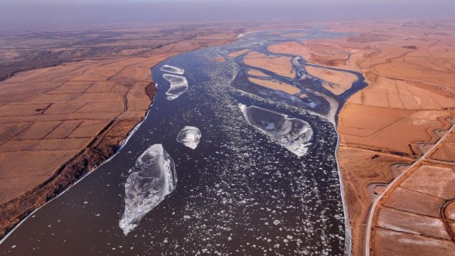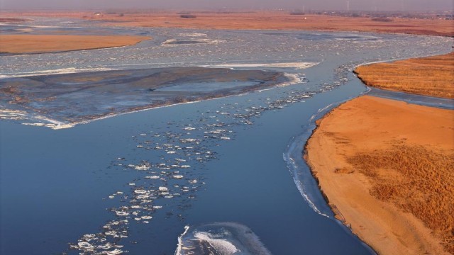 近日,受持续低温寒潮天气影响,黄河宁夏段出现流凌景观。朵朵冰凌,如同盛开在河面上的“冰花”,与黄河两岸的冬日景色构成一幅独特的黄河冬景图。