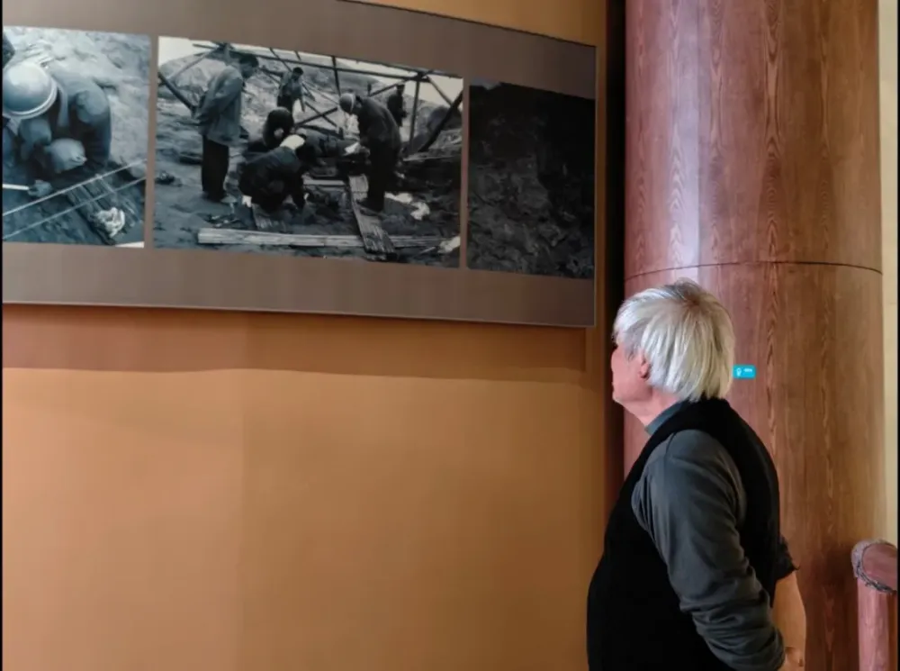 2024年4月8日,龙京沙在里耶秦简博物馆凝望2004年秦简发掘现场的照片 。新华每日电讯记者翟翔 摄