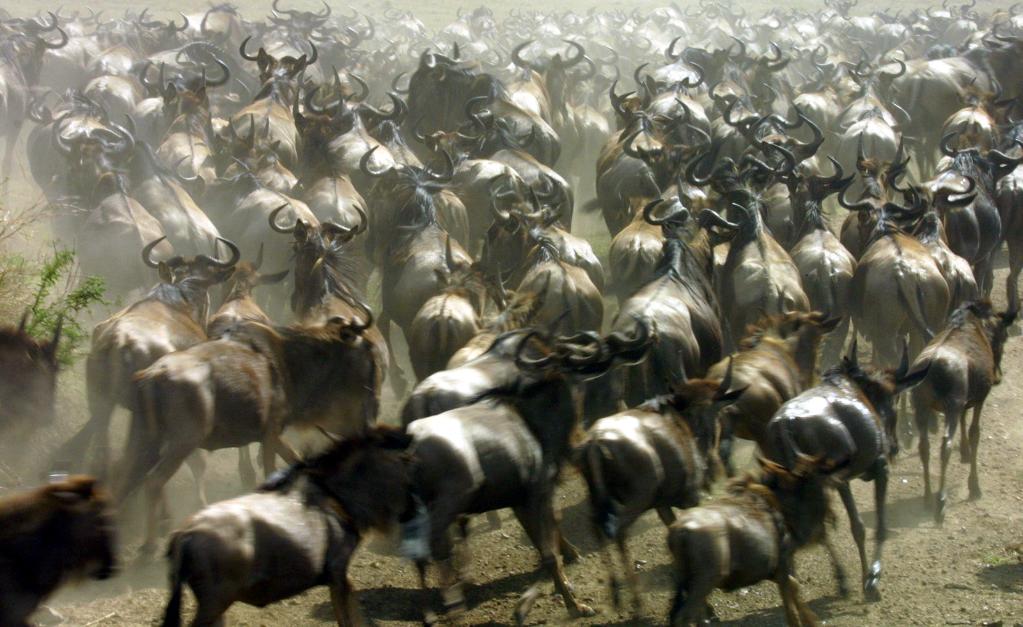 在千里之外的非洲,每年7月至9月,为了追逐水源和青草,数百万头角马、斑马和羚羊等食草动物组成一支浩浩荡荡的迁徙大军,从坦桑尼亚塞伦盖蒂国家公园向肯尼亚马赛马拉国家保护区迁徙,这就是东非野生动物大迁徙。当数百万头野生动物从面积广阔达数万平方公里的塞伦盖蒂,迁徙到仅有不到2000平方公里的马赛马拉的时候,迁徙达到高潮。