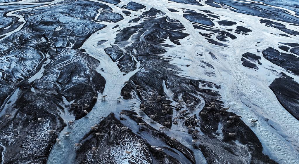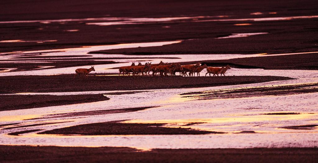 ↑ 在羌塘国家级自然保护区,藏羚羊越过甜水河,前往“产房”。