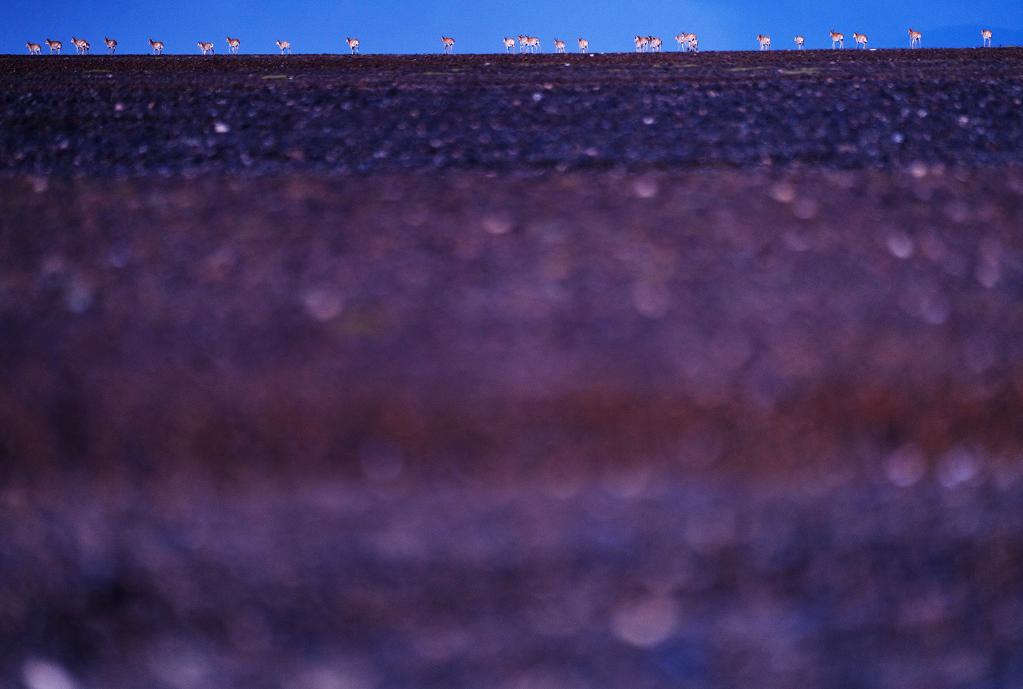 每年5月至7月,藏北羌塘国家级自然保护区内的母藏羚羊进入迁徙繁殖季。数十万只母羊,向着羌塘保护区深处的玛尔盖茶卡附近和玉龙河畔的产羔地迁徙,于此生下小羊羔后再回迁。