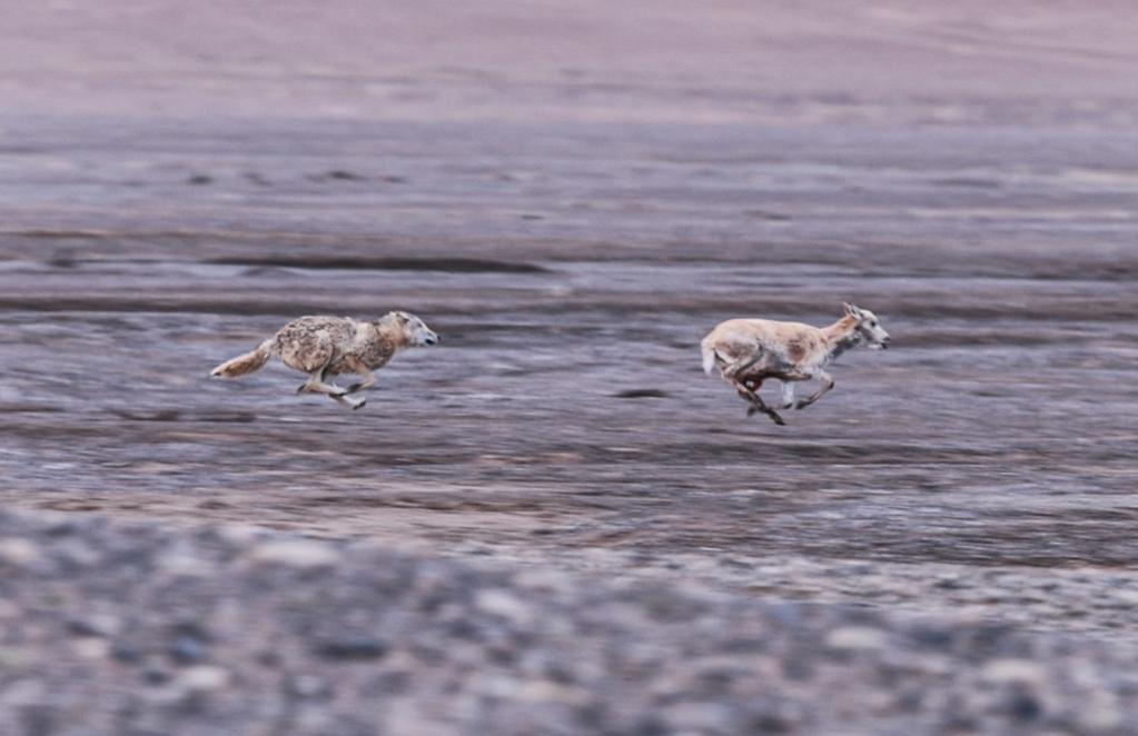 ↑ 在羌塘国家级自然保护区,一只野狼正在捕食迁徙中的母藏羚羊。在藏羚羊的迁徙过程中,野狼、雪豹、藏马熊和藏野狐等掠食动物守候在迁徙路上,随时准备捕食。