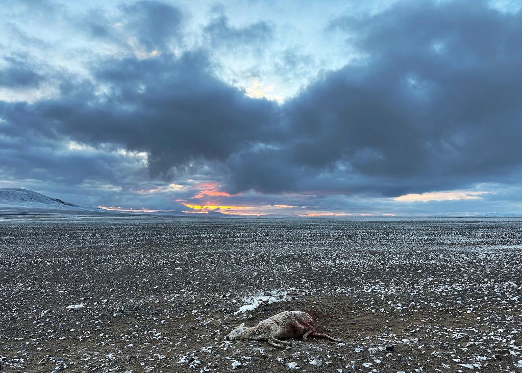 ↑ 在羌塘国家级自然保护区,一只被野狼咬死的母藏羚羊躺在雪后的草原上。