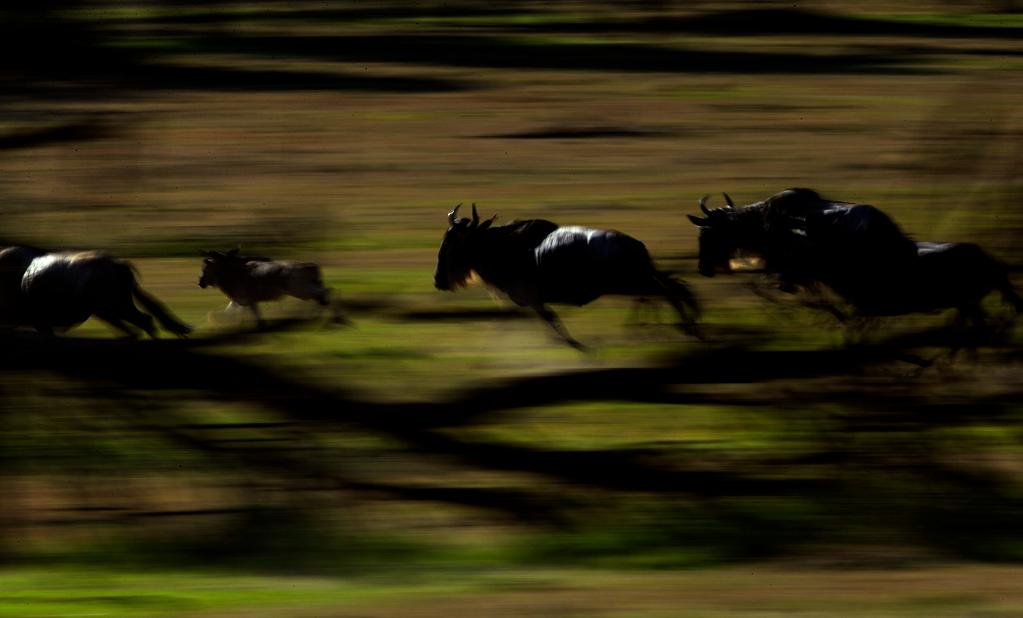 ↑ 在马赛马拉国家保护区,迁徙中的角马因为感受到某种危险而奋力奔跑。