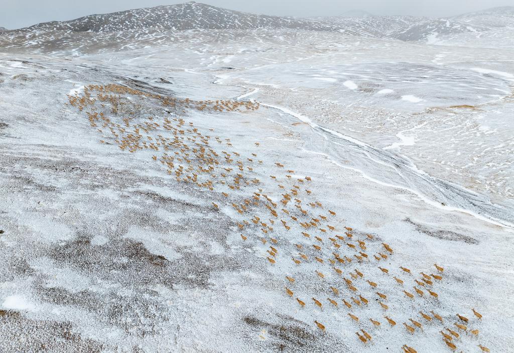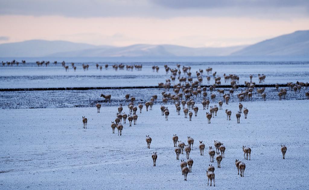 ↑ 在羌塘国家级自然保护区,藏羚羊在觅食。