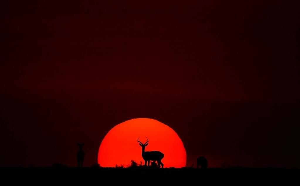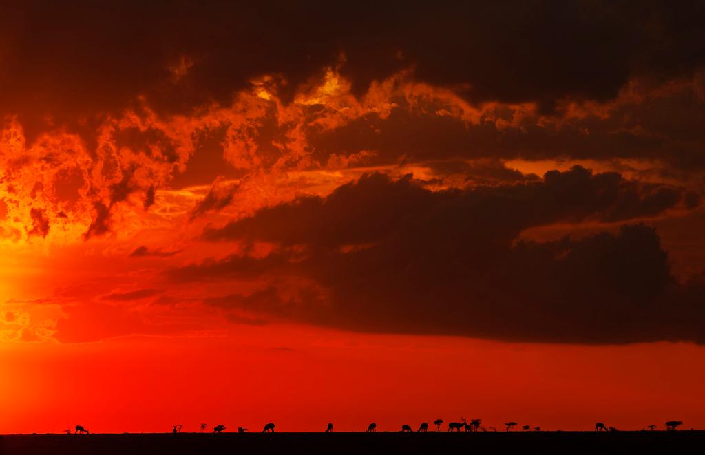 ↑ 在马赛马拉国家保护区,迁徙中的野生动物在夕阳下觅食。