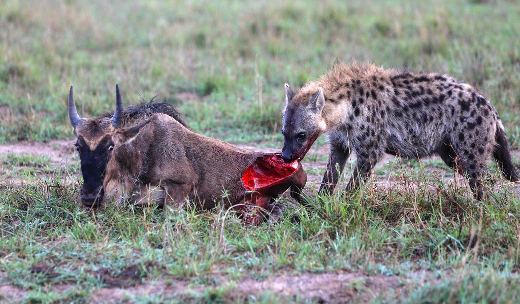 ↑ 在马赛马拉国家保护区,一头迁徙中的角马成了鬣狗的食物。在角马迁徙过程中,狮子、猎豹、花豹、鬣狗以及马拉河中的鳄鱼等掠食动物环伺其周,伺机而动。