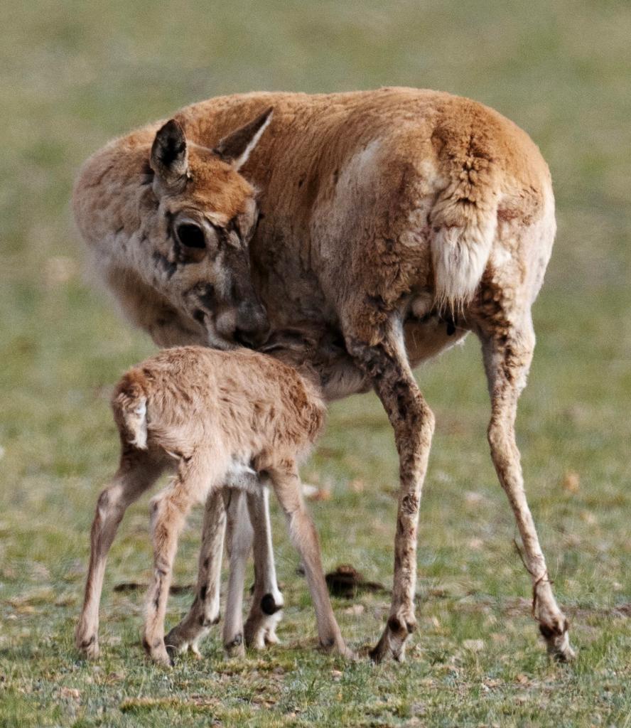 2024年6月17日,羌塘国家级自然保护区境内的西藏那曲市申扎县买巴乡鲁确塘草原上一只刚出生不久的小藏羚羊在吃奶。