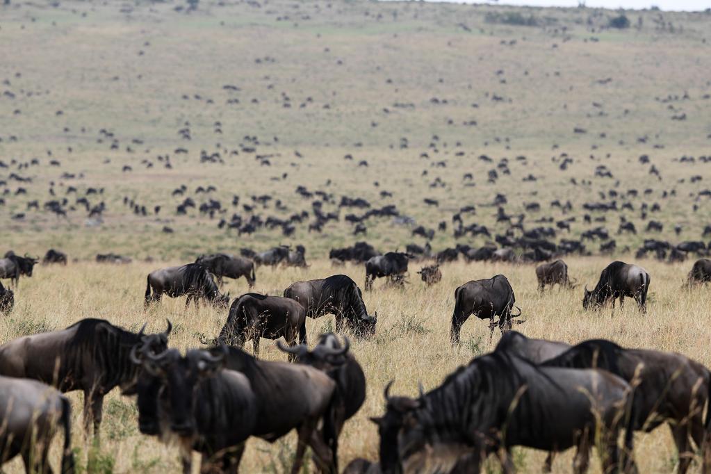 在肯尼亚马赛马拉国家公园内,迁徙中的角马在草原上觅食。