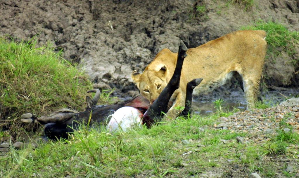 ↑ 在马赛马拉国家保护区,一头狮子正在享用自己的猎物。