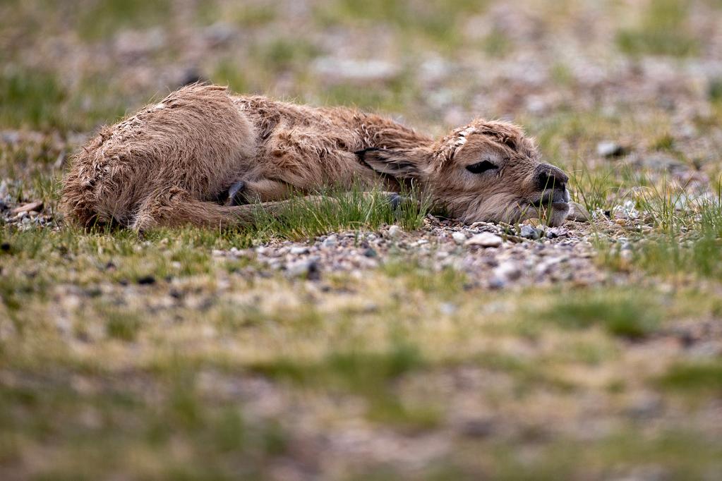 2024年6月17日,羌塘国家级自然保护区境内的西藏那曲市申扎县买巴乡鲁确塘草原上一只刚出生不久的小藏羚羊。