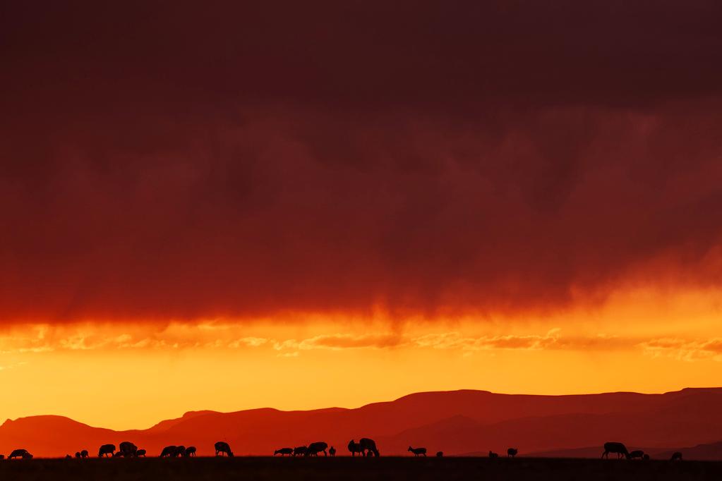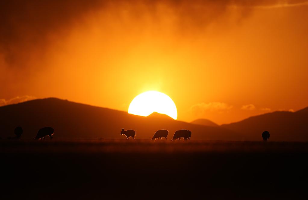 ↑ 在羌塘国家级自然保护区,藏羚羊在夕阳下觅食。