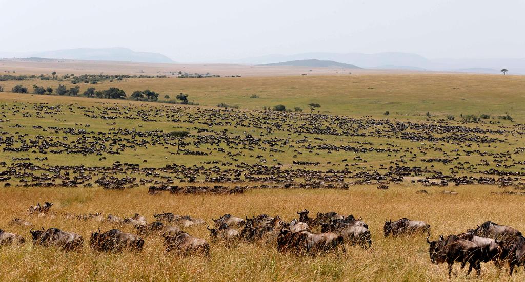 ↑ 在马赛马拉国家保护区,迁徙中的野生动物在草原上觅食。