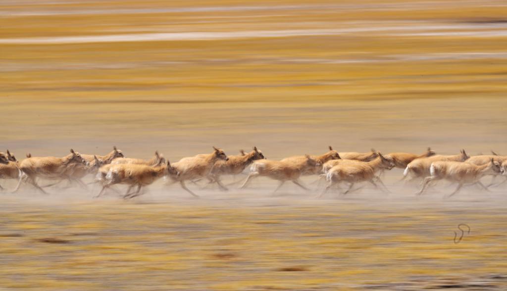 ↑ 在羌塘国家级自然保护区,迁徙中的藏羚羊因为感受到危险而奋力奔跑。