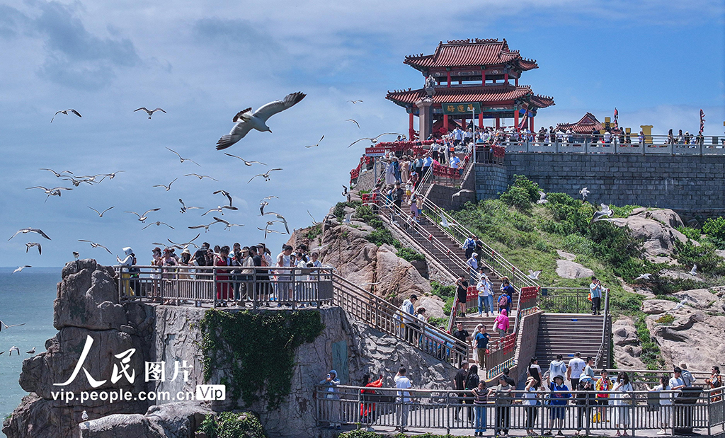 2024年7月6日,在山东省荣成市北部沿海各景区,游客们观海听潮,与黑尾鸥互动,观看特色民俗表演。李信君摄(人民图片网)
