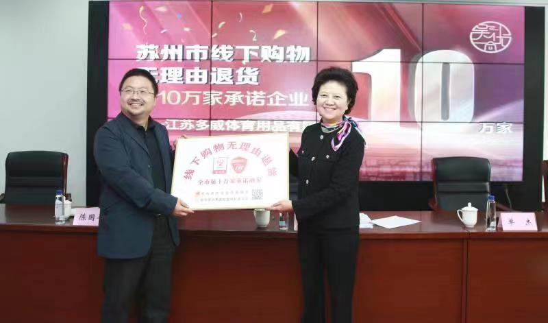 10月28日,苏州市线下购物无理由退货第10万家签约商家授牌仪式在昆山举行。活动现场,苏州市市场监管局副局长钱玲为第10万户签约商家江苏多威体育用品有限公司授牌。自此,苏州成为全国首个签约商家突破10万家的城市,数量已达江苏省三分之二。