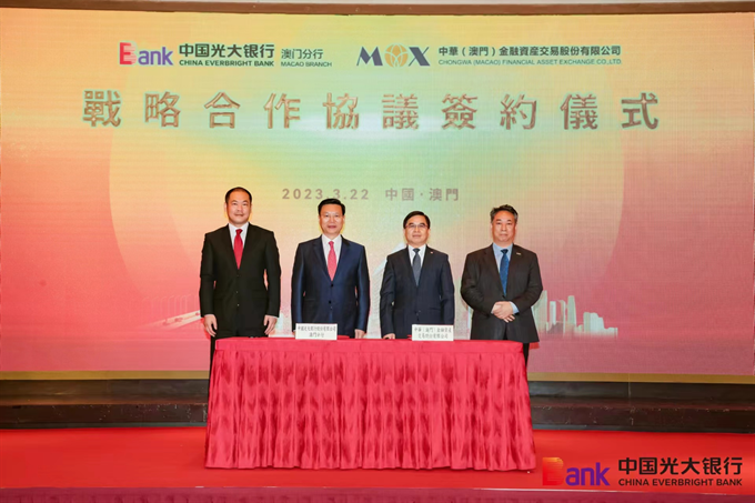 开业仪式上,光大银行澳门分行与中华(澳门)金融资产交易股份有限公司签署战略合作框架协议。根据协议,双方将积极探索合作机制,推进资源共享、优势互补,共同支持境内外企业拓宽融资渠道,助力企业和金融机构“走出去”,支持澳门金融市场发展。