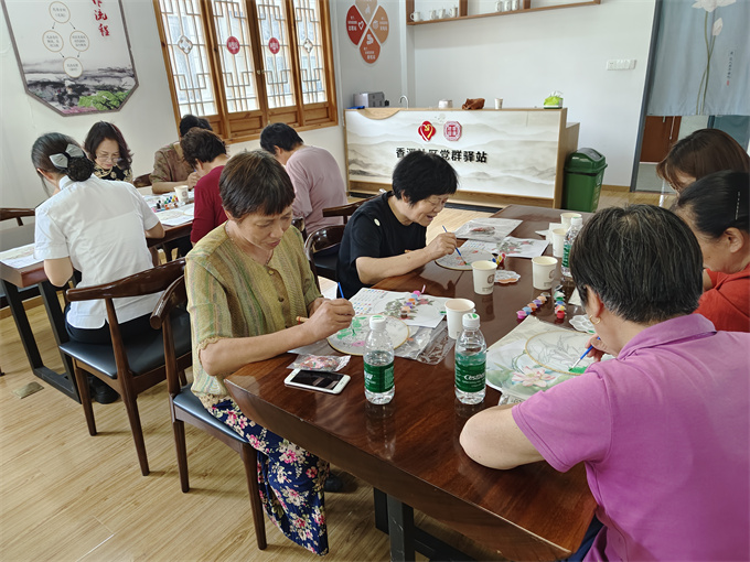 活动开始,社区志愿者为大家介绍了端午的来历、习俗并且讲解了香囊的制作方法以及画扇的技巧。现场欢声笑语,居民群众们拿起白色的团扇,认真地上色,一笔笔、一画画......渐渐地,原本单调的扇面开始变得缤纷多彩富有生命力,朵朵高洁的莲花、清幽的梅花等呼之欲出。随后,居民群众们拿起香包DIY材料包开始制作,从穿针引线到填充香料再到钉扣收尾,每一个步骤都认认真真地学,仔仔细细地做,把最美好的祝愿缝进香包。在志愿者的指导下,一个个立体饱满又精致的香囊很快就在大家的手中呈现出来了。虽然制作香包的手工参差不齐,但活动现场气氛热烈,居民群众们在制作过程中感受着传统手艺的魅力与浓浓的端午氛围。
