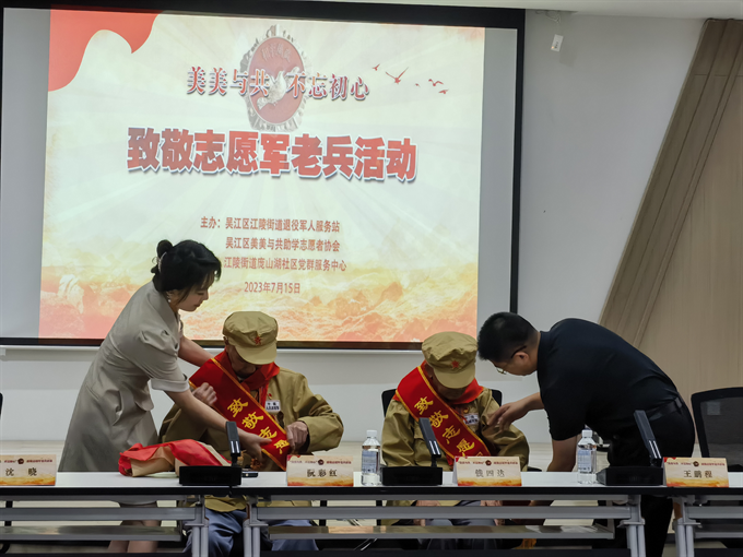 活动请到了两位中国人民志愿军老兵,他们是钱四达、阮彩红。当两位老战士走进会场时,全体人员站立鼓掌欢迎,大家眼中满含敬仰与崇拜;胸佩勋章、身穿志愿军军装的老战士给大家报以标准的军礼。现场气氛热烈与隆重。同学们给两位老战士戴上了鲜艳的红领巾,家长们给老战士佩上了“致敬志愿军老兵”的绶带,表达深深的敬意与感谢。吴江区美美与共助学志愿者协会为江陵街道目前健在的6位志愿军老兵赠送了慰问品。