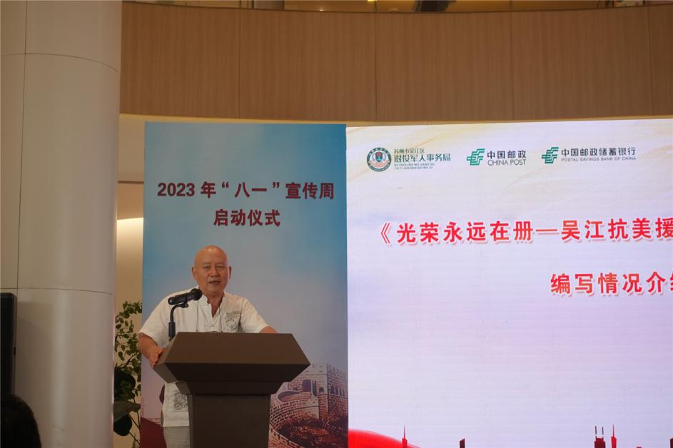 8月1日,苏州市吴江区举行2023年“八一”宣传周启动仪式。发布了苏州市吴江区退役军人和其他优抚对象优待目录清单(第一版);举行了《光荣永远在册——吴江抗美援朝老战士追访记》首发式。还就优待目录清单(第一版)的发布回答记者现场提问。吴江区政协文化文史委主任沈伟荣,吴江区退役军人事务局副局长何进康、李震乾等领导嘉宾出席了活动。