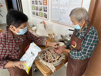 10月19日,界路村日间照料中心开展“爱心重阳,糕暖人心”活动。一大早,日间照料中心的工作人员及2位志愿者为准备活动材料早早的来到活动室忙活起来,大家戴上口罩和手套,拌粉、烧开水、准备食材……忙得不亦乐乎。经过几个小时的忙碌,热气腾腾,浓香扑鼻的重阳糕制作完成。糕点里,装满了核桃、花生、红枣、葡萄干等七八种食材,重阳糕上洒满了红绿丝,看起来诱人无比。浓厚的香味,在日照中心门口就能闻到。