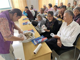 志愿者讲重阳糕分给了老人们,大家一边品尝一边说:“自己做的重阳糕味道老好了,而且没放糖,特别适合我们年纪大的人,软软糯糯的,牙口不好也能吃!”空气中弥漫着浓浓的糕点香气,老人们一边品尝着糕点,一边愉快地交流着彼此的生活趣事,感受着界路村的温暖和关爱。
