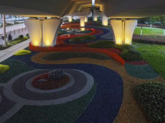 考虑到高架桥下光照不足的问题,此次工程采用彩色覆盖物铺设桥荫空间,搭配粉刷一新的桥体,矾根、肾蕨、金叶过路黄等植物组合,以及景石及胶黏石构成的环状图案,为桥荫空间注入生机。