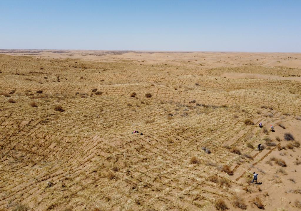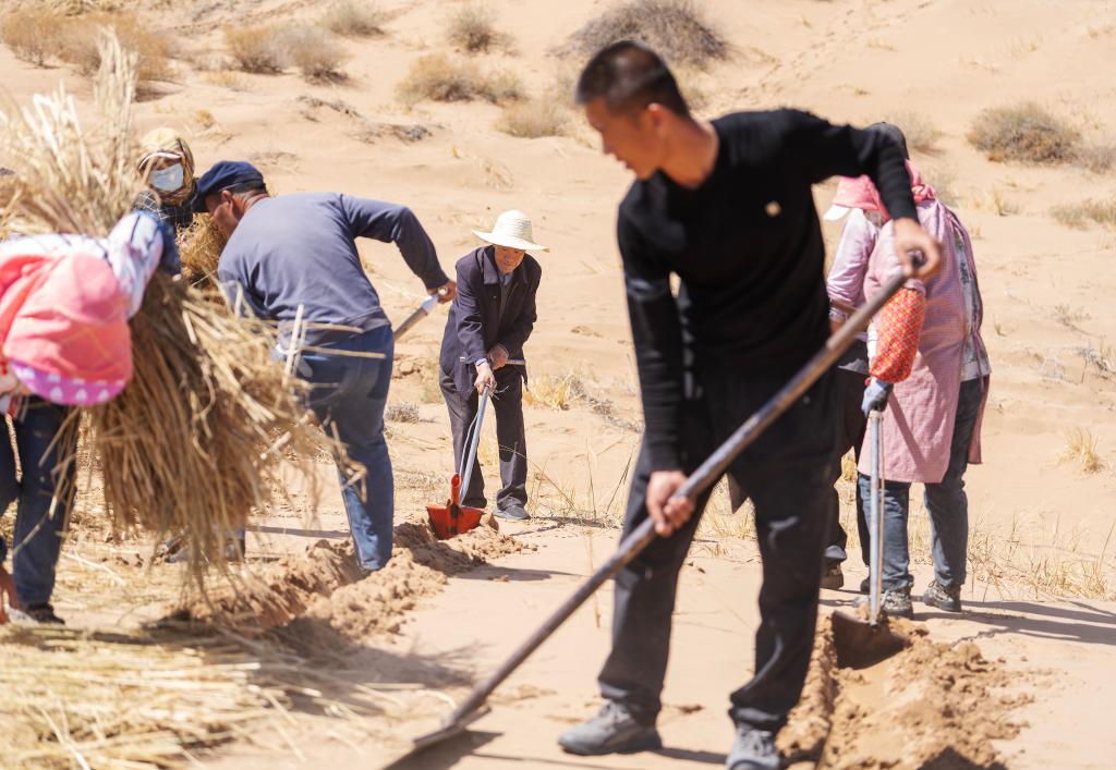 4月10日,群众在古浪县八步沙林场麻黄塘沙区用草方格压沙(无人机照片)。