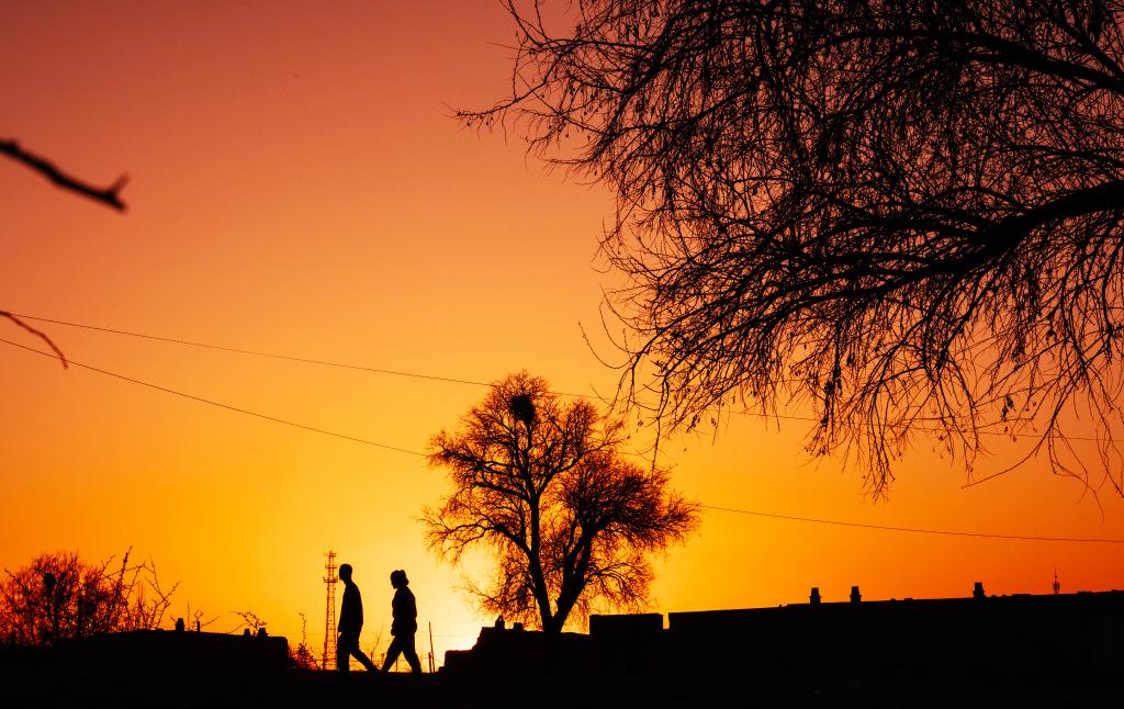 4月10日傍晚,在古浪县土门镇,郭玺(左)和妻子晚饭后散步。