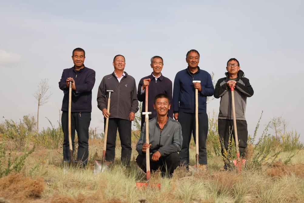 2023年5月6日,八步沙两代治沙人在古浪县的一片治沙区劳作后合影留念。他们从左至右分别为:罗兴全(后左一)、石银山(后左二)、郭万刚(后中)、贺中强(后右二)、程生学(后右一)、郭玺(前)。