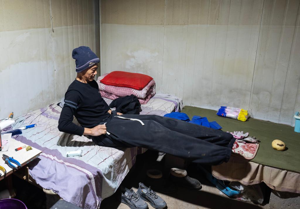 4月10日清晨,在古浪县八步沙林场林下经济养殖专业合作社,郭玺换上衣服准备喂鸡。
