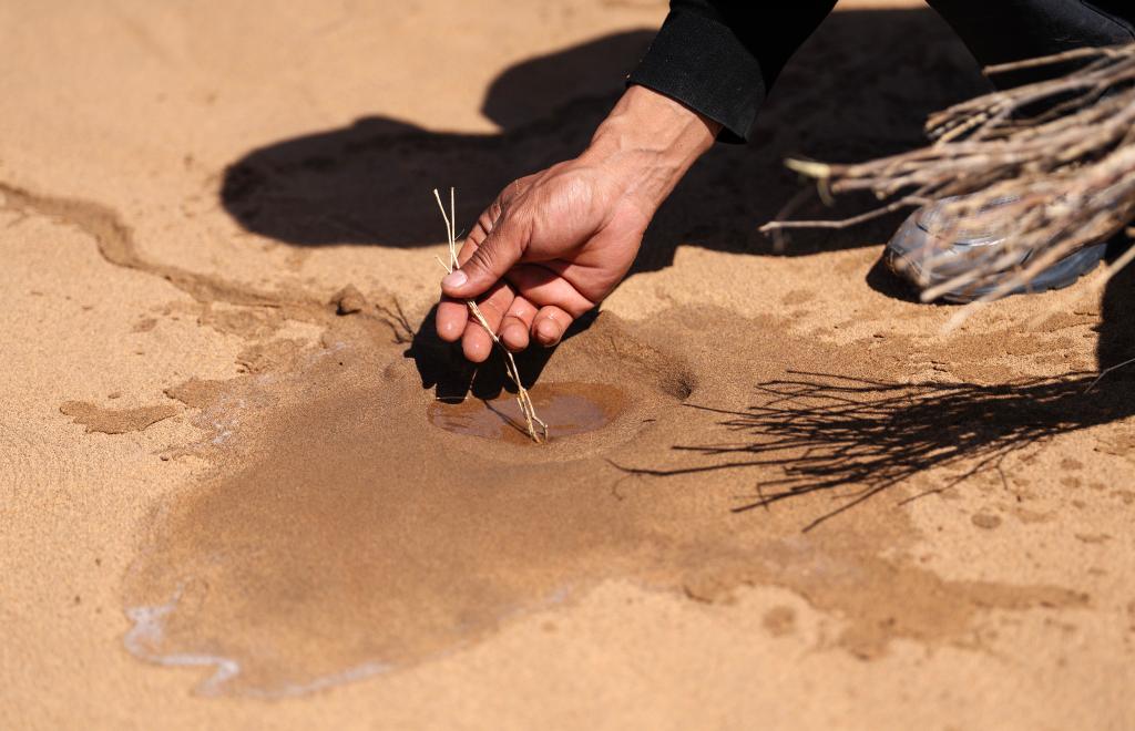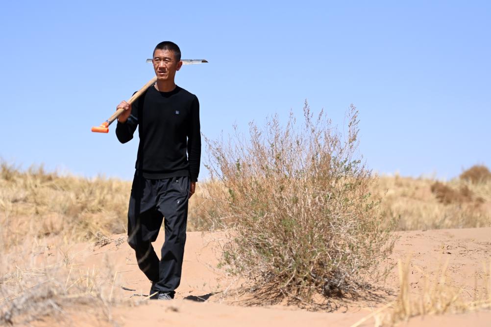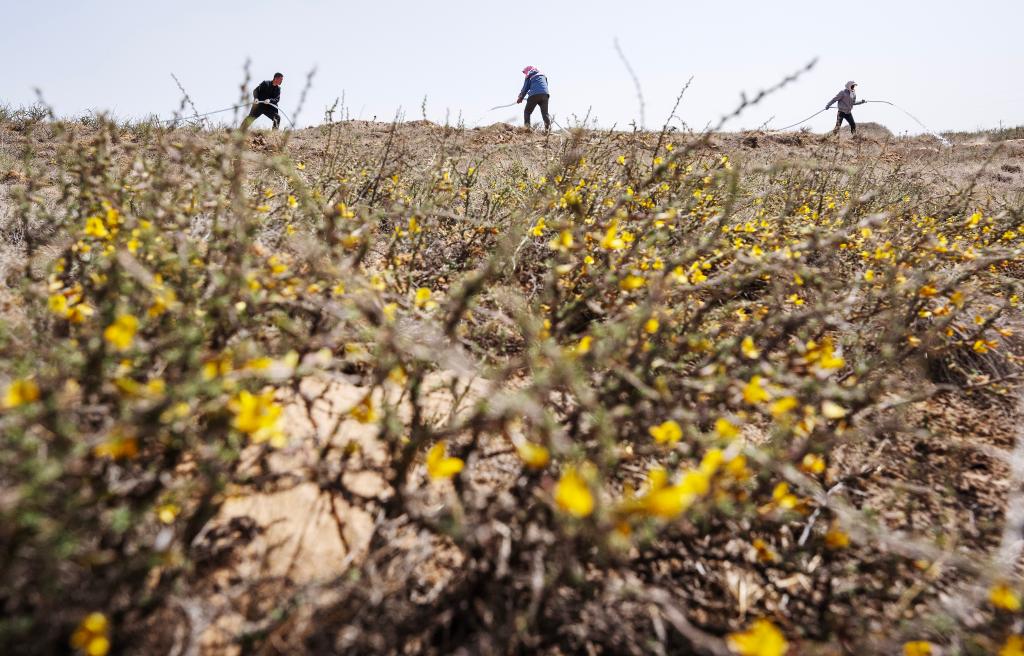 4月10日,在古浪县八步沙林场麻黄塘沙区,郭玺在沙漠里种植花棒。