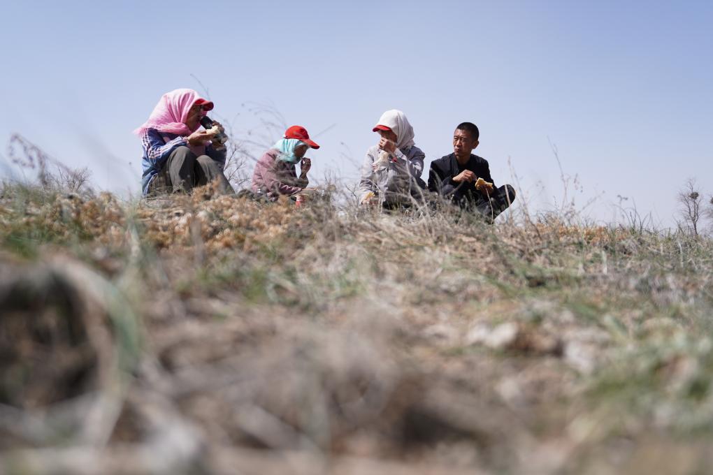 4月11日,在古浪县八步沙林场眼窝子沙治沙点,郭玺(右)和林场职工在午休时吃饭。