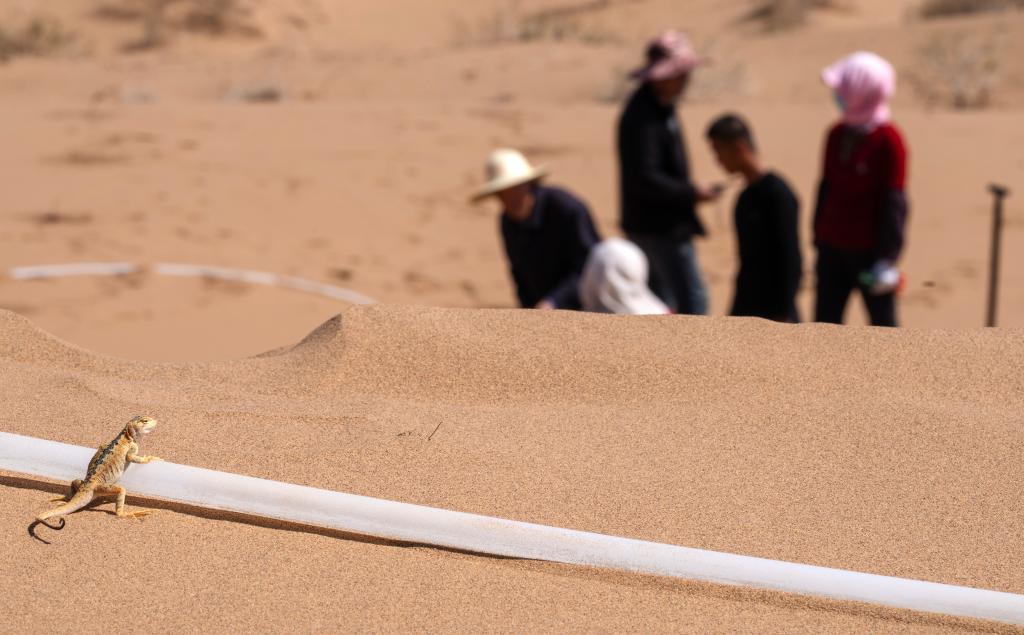 4月10日,在古浪县八步沙林场麻黄塘沙区,郭万刚(左一)和郭玺(右二)在沙漠里种植花棒时,一只被当地人称为“沙娃娃”的蜥蜴在一旁。