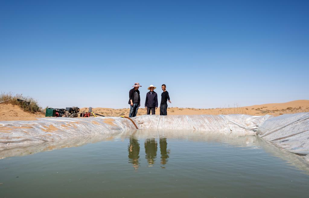 4月10日,在古浪县八步沙林场麻黄塘沙区,八步沙第二代治沙人郭万刚(中)和郭玺(右)查看沙漠里的蓄水池。
