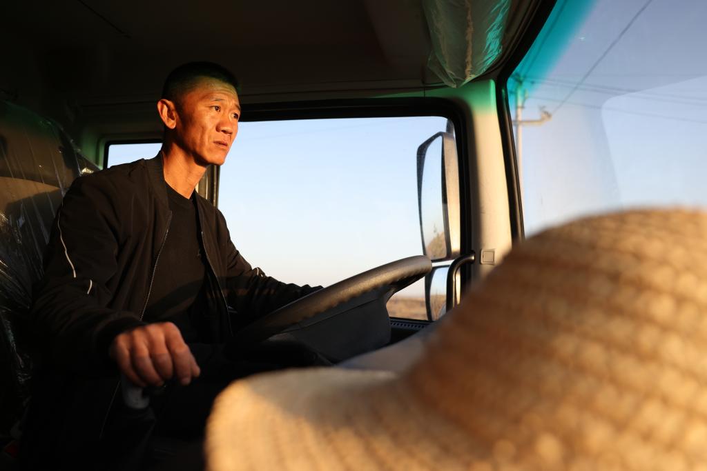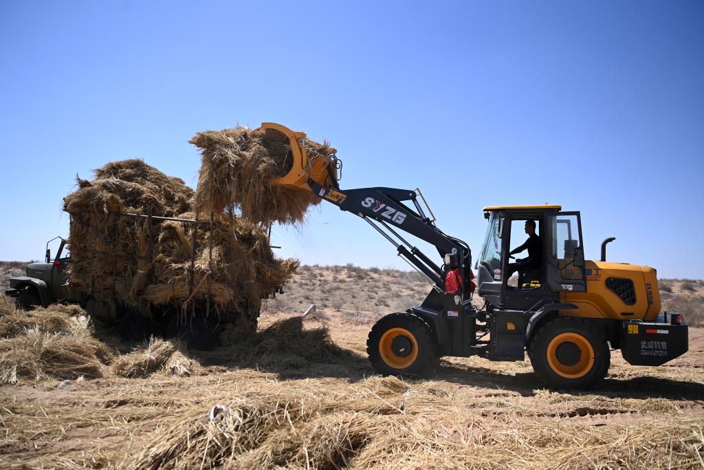 4月10日,在古浪县八步沙林场麻黄塘沙区,郭玺驾驶装草机转运压沙用的稻草。
