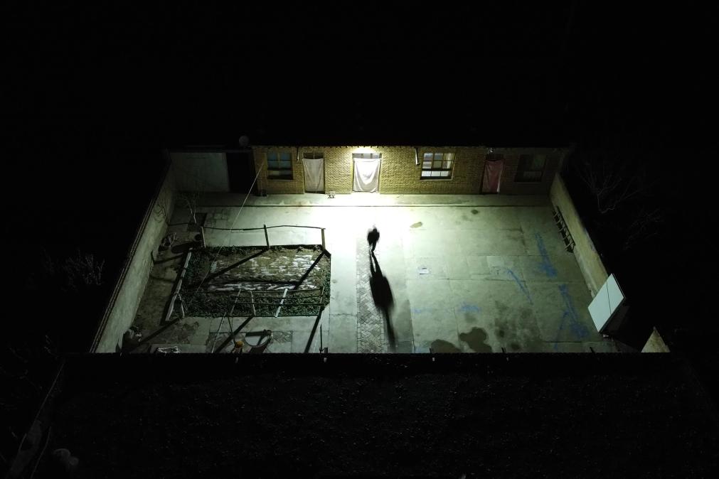 4月10日清晨,郭玺从古浪县土门镇的家中出发准备前往八步沙林场林下经济养殖专业合作社喂鸡(无人机照片)。