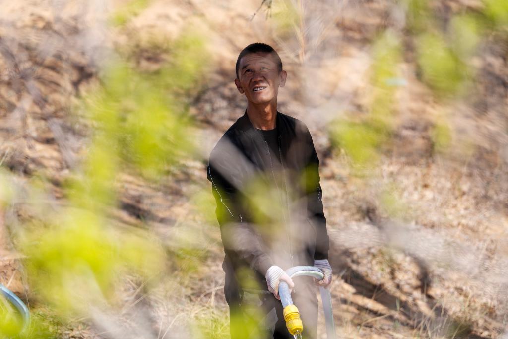 4月10日,在古浪县八步沙林场眼窝子沙治沙点,郭玺浇灌植被。